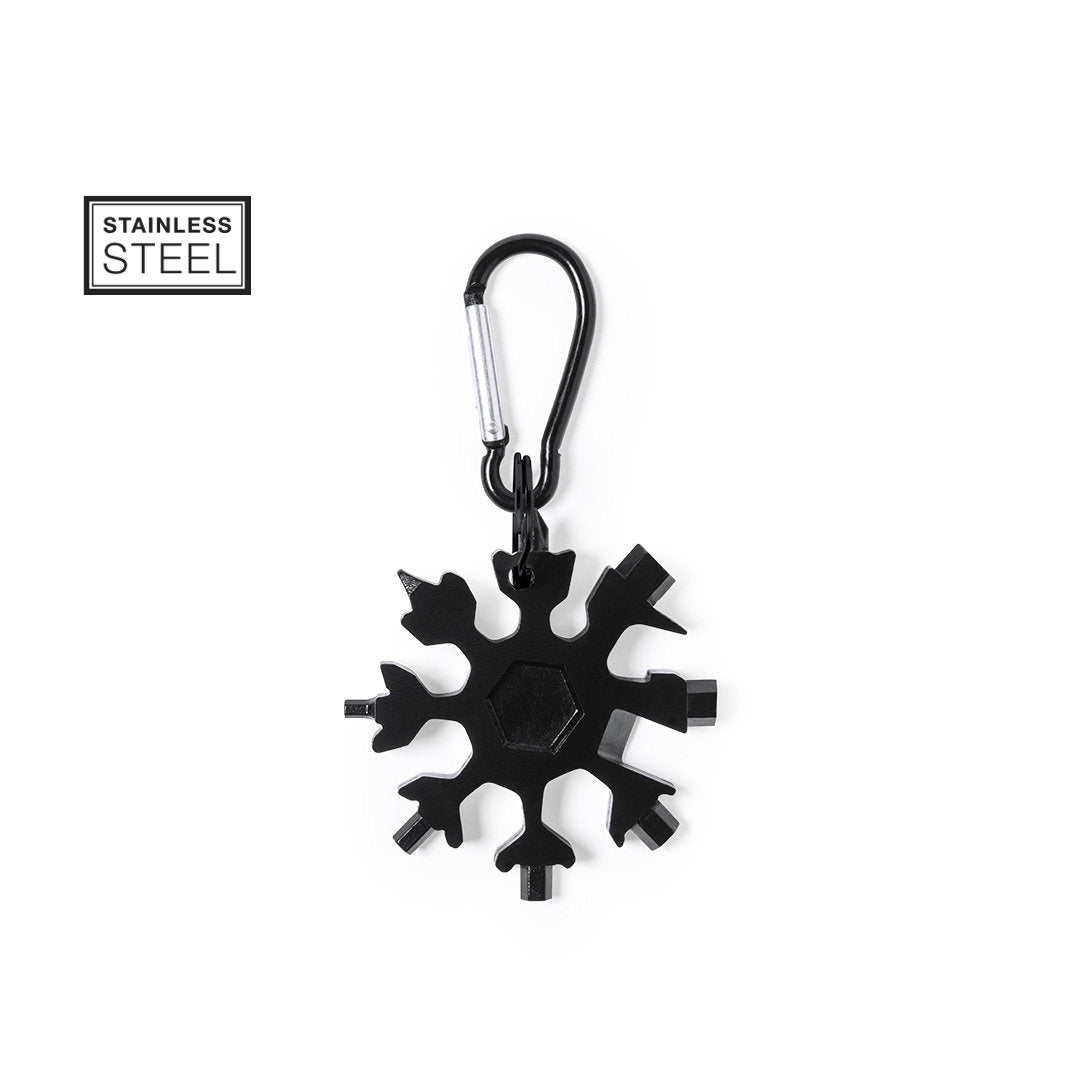 Genuine and handy multi-tool made in resistant stainless steel in black finish, with matching ring and carrying carabiner. With 17 functions, including flat and philips tips screwdriver hexagonal allen spanners knife and bottle opener. Presented in an individual black box.
