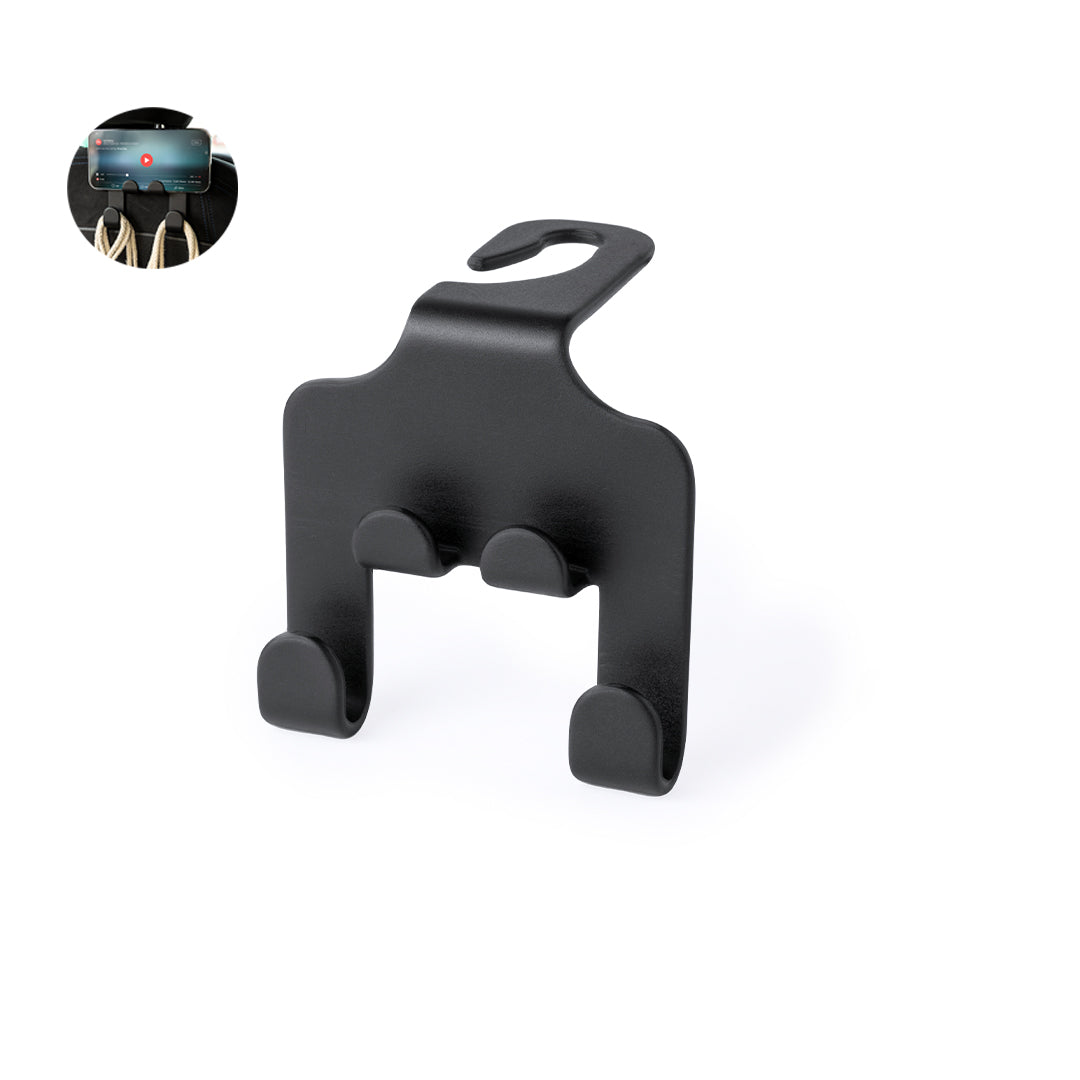 Robust holder made of ABS. Easy installation using the open hook designed to be placed on the headrest, with holder for mobile devices and two additional hooks for bags. Presented in an individual bag.