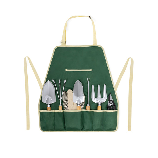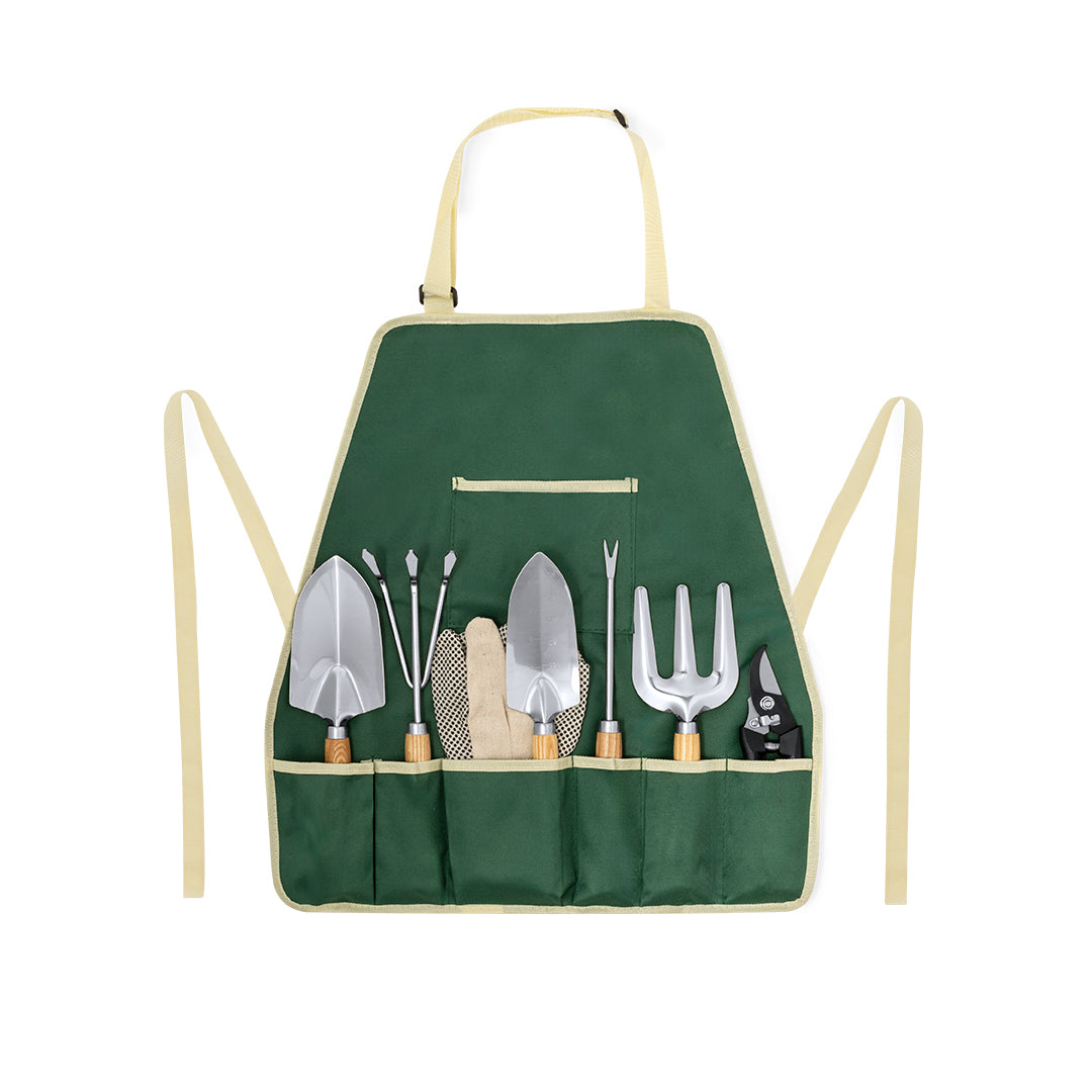 Complete gardening set with 7 accessories and adjustable apron with pockets. Including 2 shovels in different sizes, two rakes, an awl, pruning shears and gloves. Presented in a kraft design box.
