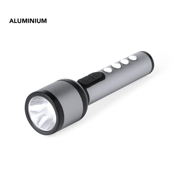 Powerful torch made of Aluminium with a classy design in a metallic grey finish with black accents. It has 1 front LED for spot illumination and 4 COB lights in the handle for flood light. It features 3 lighting modes: steady, slow flashing and fast flashing, adapting to different needs. This torch is rechargeable via 1200 mAh battery, with charging cable included. Presented individually in a kraft design box.