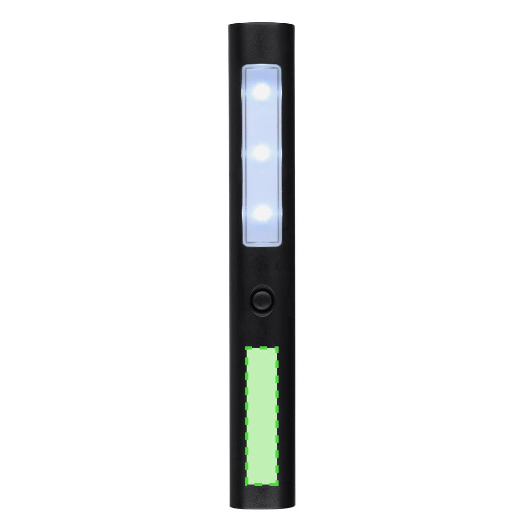 3 LED flashlight with durable ABS body, with button on the front and practical magnets on the back. Powered by button batteries included.