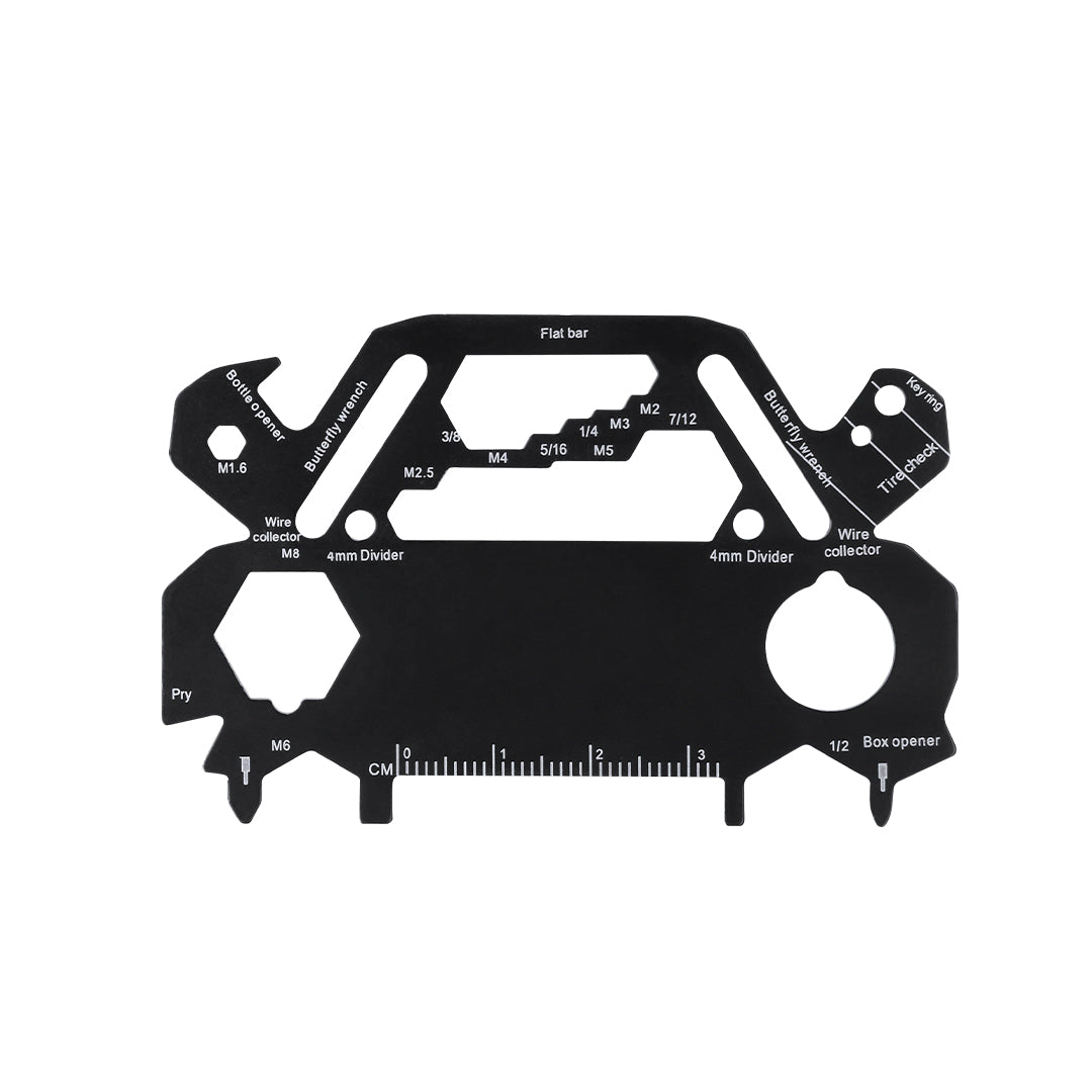 Original and practical multi-tool in stainless steel shaped like a car. With 30 functions, including: flat and Philips screwdriver, wrench for hex nuts in various sizes, ruler, and bottle opener.