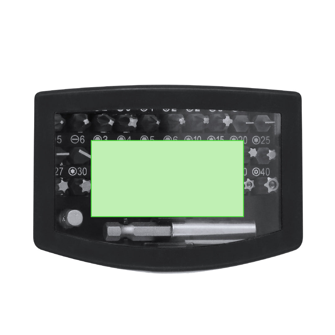 Practical tool set with case made of ABS. Includes a precision adapter with 32 magnetic accessories, consisting of various tips: philips, star, flat, hexagonal and torx.