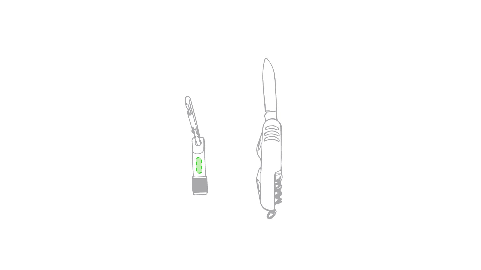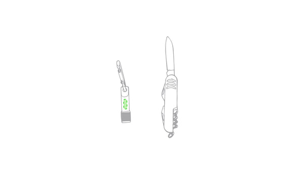 Set of aluminum knife with 7 functions and carabiner flashlight. In varied colors and presented in an individual box with window and soft foam inside. Button cell batteries included.