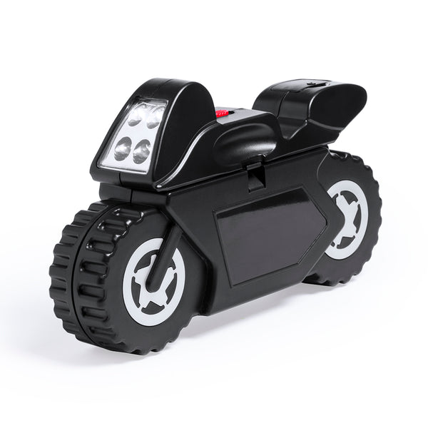 Tool set of 14 accessories in resistant case with motorcycle design, with built-in 4 LED flashlight. Includes set of precision screwdrivers, clamping tool, flat and crosshead screwdriver heads and wrenches for hexagonal nuts. Button cell batteries included. Presented in an individual box.