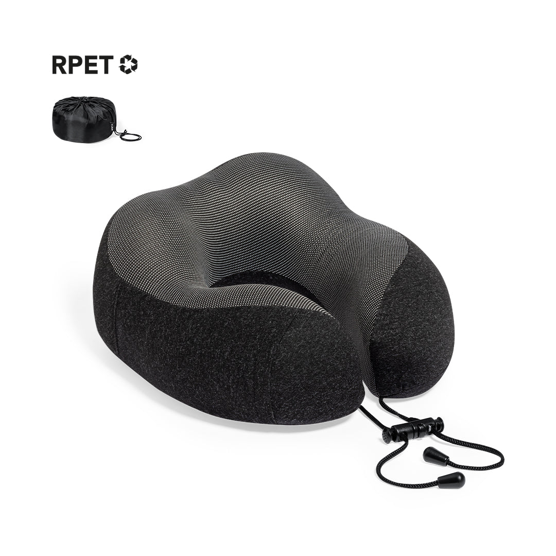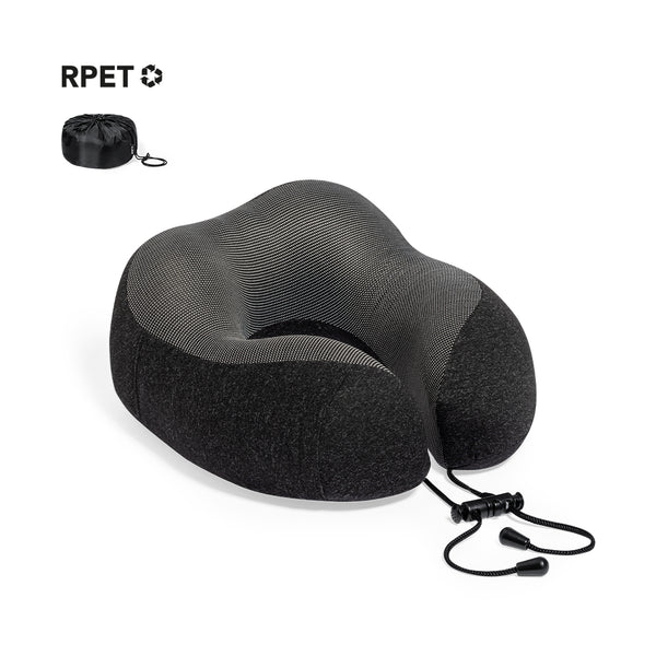 Comfortable and padded portable neck pad. Ultimate comfort experience for any journey due to the soft touch padding and drawstring fasteners for a correct and comfortable fit. With RPET pouch for protection during transport and label.RPET material is made from recycled plastic, thus promoting the reuse of plastic waste and helping the sustainability of the planet.