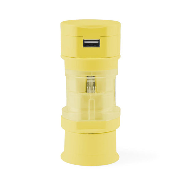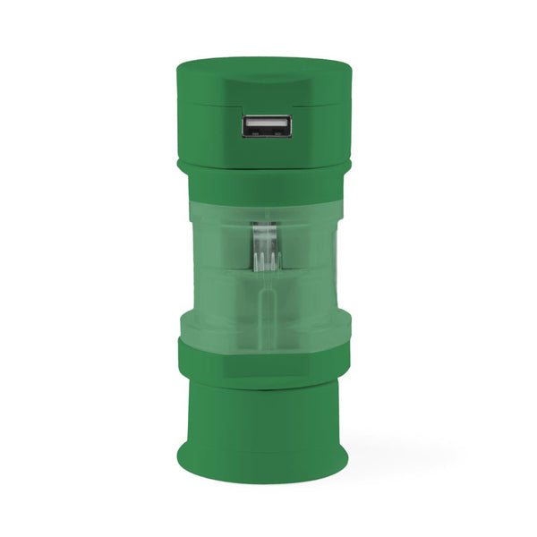 Plug adapter with USB output. With a compact and portable design, 1,000 mA charging capacity and in casual colors. Especially suitable for travelers and including multi-region adapters for the USA, Europe, Asia and the United Kingdom. Presented in an individual box.