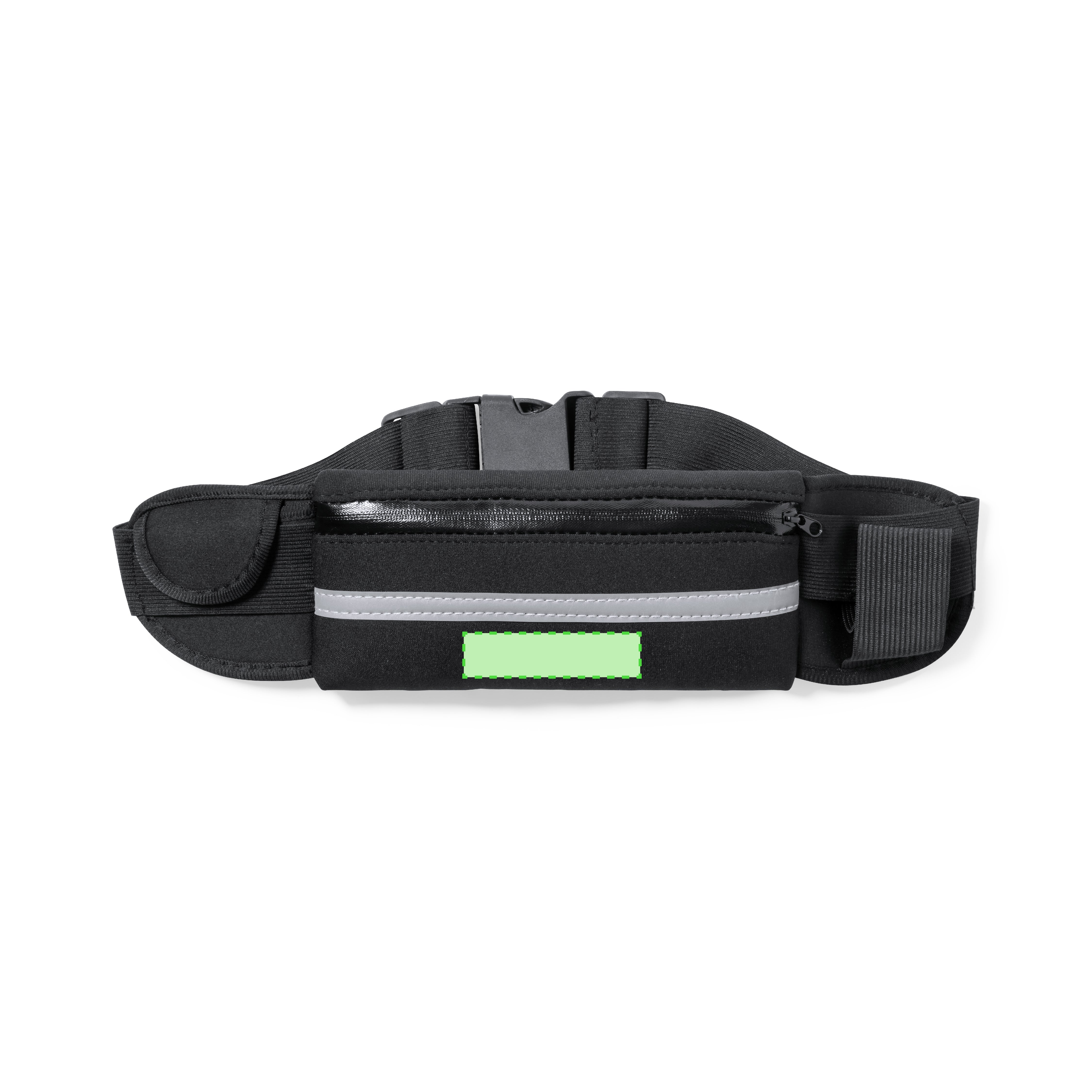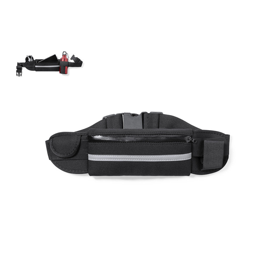 High quality waistbag made of durable soft shell (neoprene), with reflective band. Main compartment with zip closure, elastic bottle holder and pocket for keys and other small items. With buckle closure and adjustable strap, specially designed for sports and leisure activities.