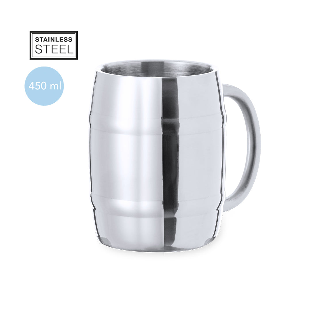 Stainless steel mug in an elegant metallic finish for the most demanding beer drinkers. With a capacity of 450 ml, comfortable handle and a fantastic barrel shape. Presented in a kraft design box.