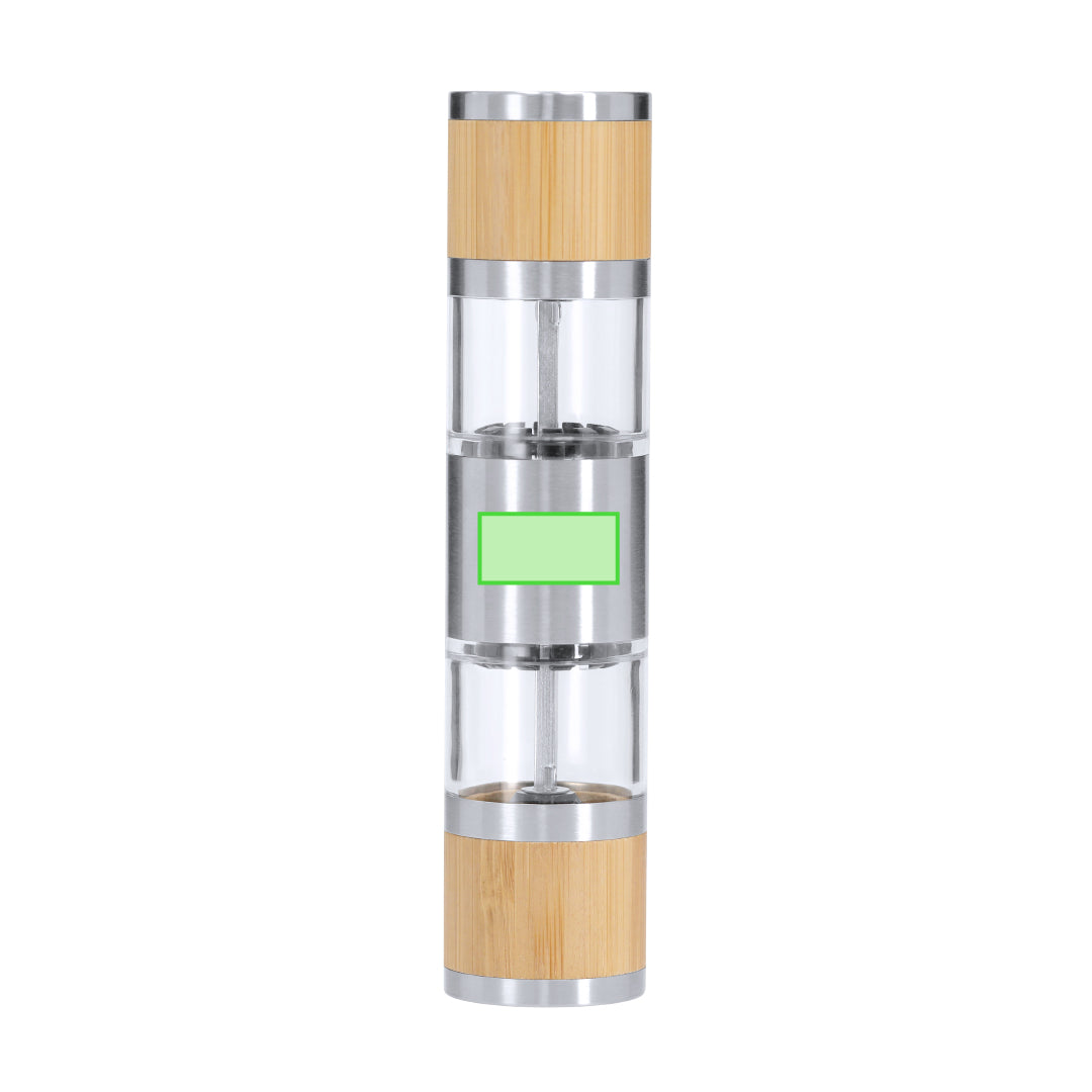 Manual grinder for salt and pepper made of Bamboo and Stainless Steel. Includes two separate compartments for salt and pepper, each with internal ceramic grinder and manual thickness adjustment. It has a window to view the level.