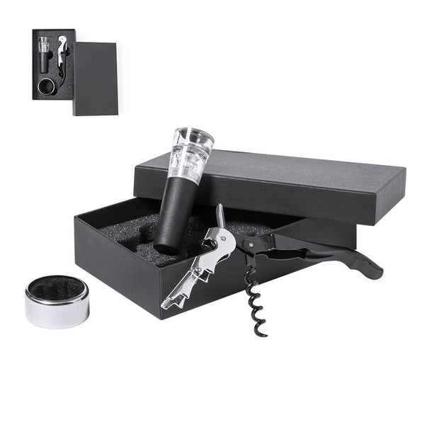 Ultimate wine set in a sober black finish, presented in an individual case with foam die-cut inside and inside white protective sleeve. Including drip stopper, stainless steel corkscrew and vacuum pump lid.