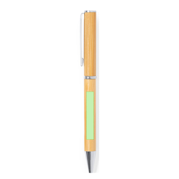 Ball pen with bamboo barrel, metal clip and chrome plated fittings. With swivel mechanism and in blue ink.Materials such as bamboo promote the use of natural raw materials, thus reducing pollutant emissions. It comes from a highly resistant and versatile plant, with rapid growth and regeneration, making it an excellent alternative to the use of traditional wood.