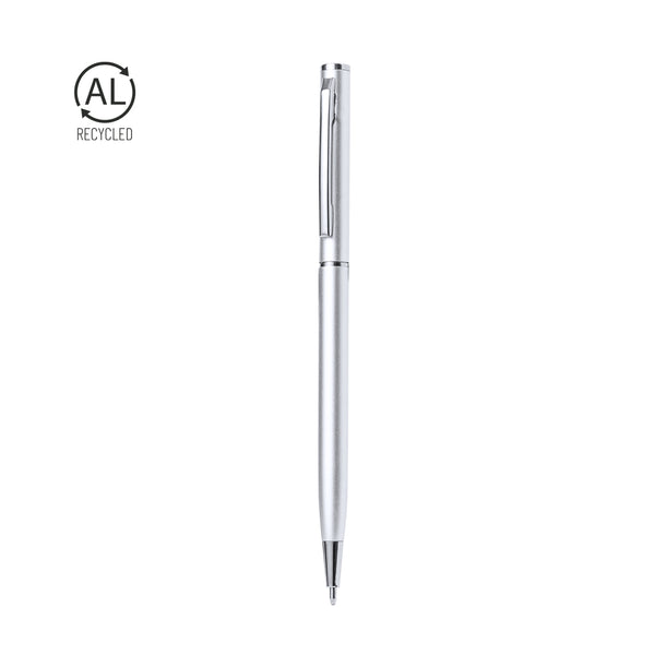 Ball pen with recycled Aluminium barrel. Metal clip and chrome plated fittings, with swivel mechanism and blue ink. With recycled Aluminium logo. Recycled Aluminium is a material with almost infinite recycling possibilities, keeping its original properties and consuming less energy during this process.GRS Certification (Global Recycled Standard), which guarantees the recycled origin of the material used to manufacture the product.