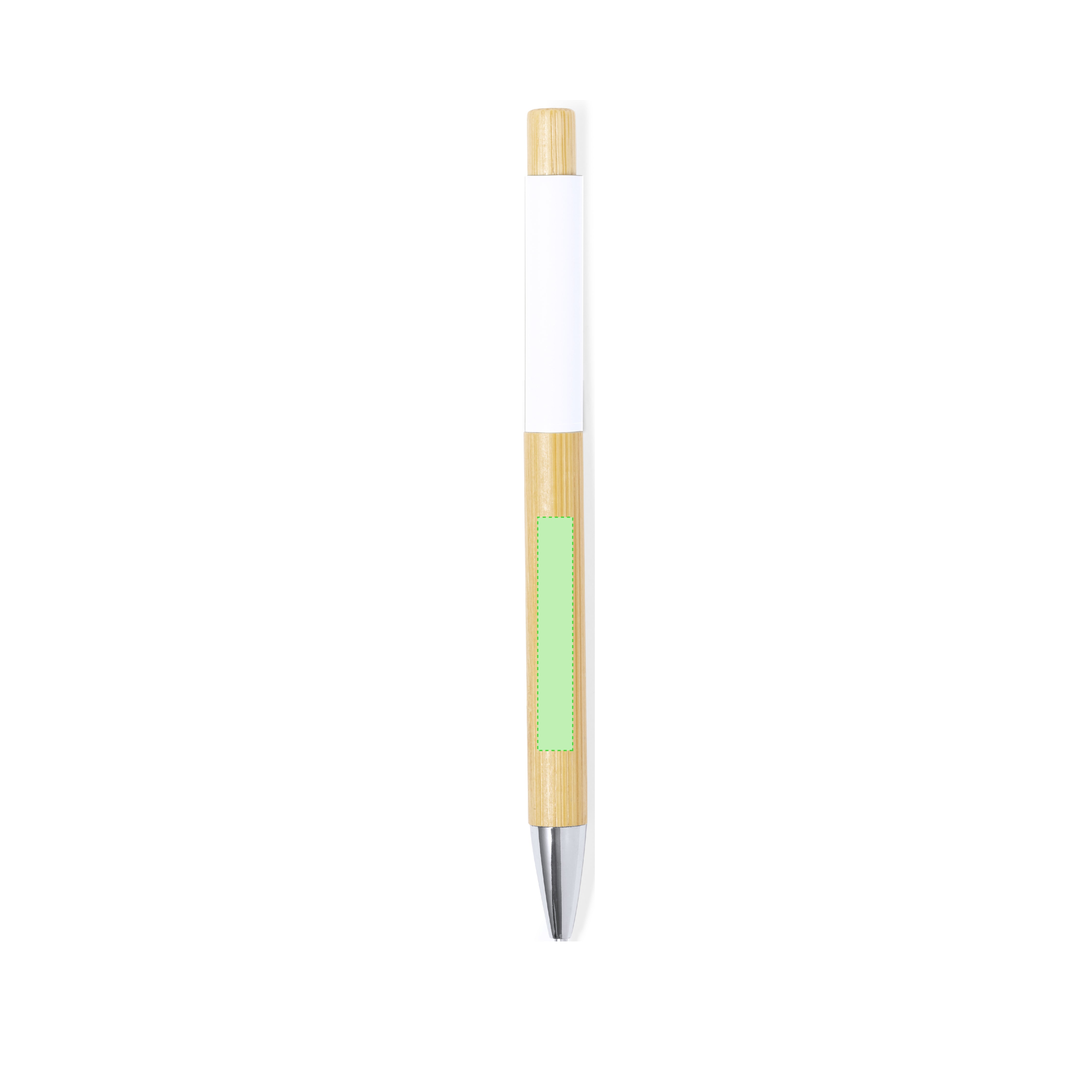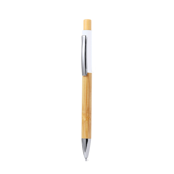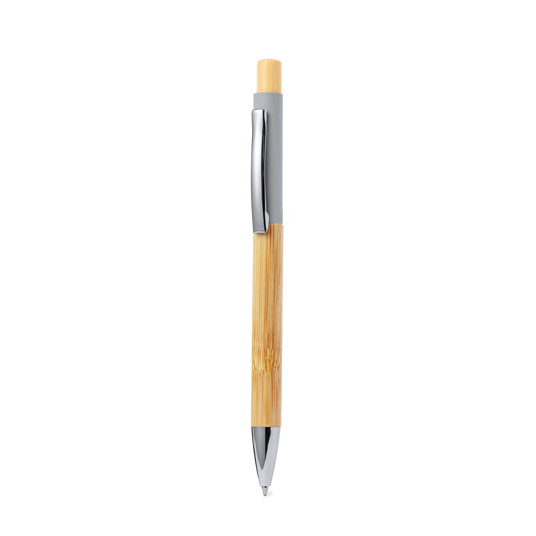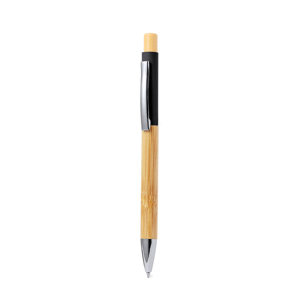 Stylish ball pen made of bamboo. Resistant Aluminium barrel with rubberised finish and bamboo grip, in a wide range of distinctive colours. Metal clip, with push-button mechanism and blue ink. Presented in an individual recycled bag.