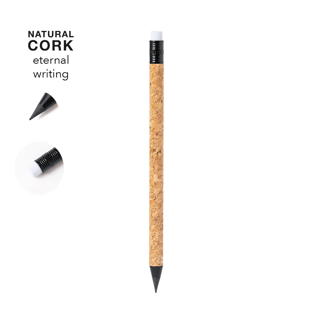 Eternal pencil made of cork. Reusable and with infinite writing, to always use the same pencil and not generate waste. Including eraser on the top of the pencil.Made with plant-based elements to promote the use of natural raw materials and reduce polluting emissions.