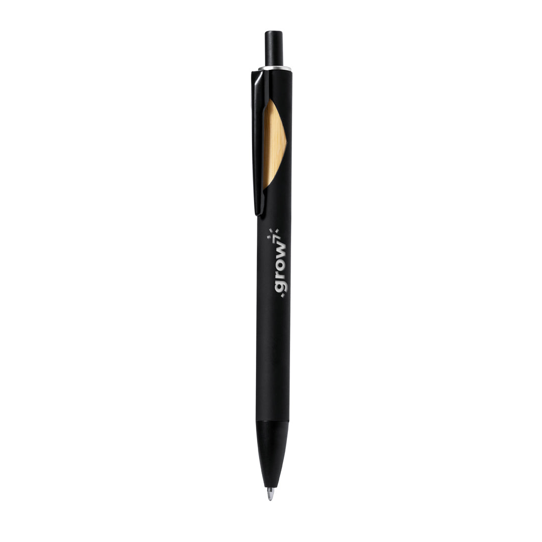 Ball pen pointer with push button mechanism. Solid black barrel and top fitting in varied colores. Especially designed for laser engraving, including a special coating for your logo to be properly engraved in matching color. In blue ink and presented in an individual recycled bag.Materials such as bamboo promote the use of natural raw materials, thus reducing pollutant emissions. It comes from a highly resistant and versatile plant, with rapid growth and regeneration, making it an excellent alternative to the use of traditional wood.
