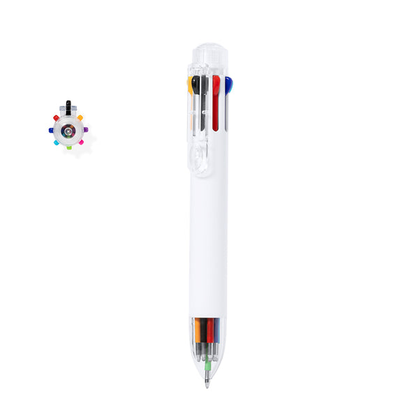8-in-1 ball pen in resistant ABS material, with 8 different colours to suit any task. Ergonomically designed and functional, making it easy to select each color option with the push buttons at the top. Its functionality makes it possible to easily select each colour of ink by using the push buttons on the top of the pen. Barrel designed in white color, with transparent clip and fittings.