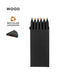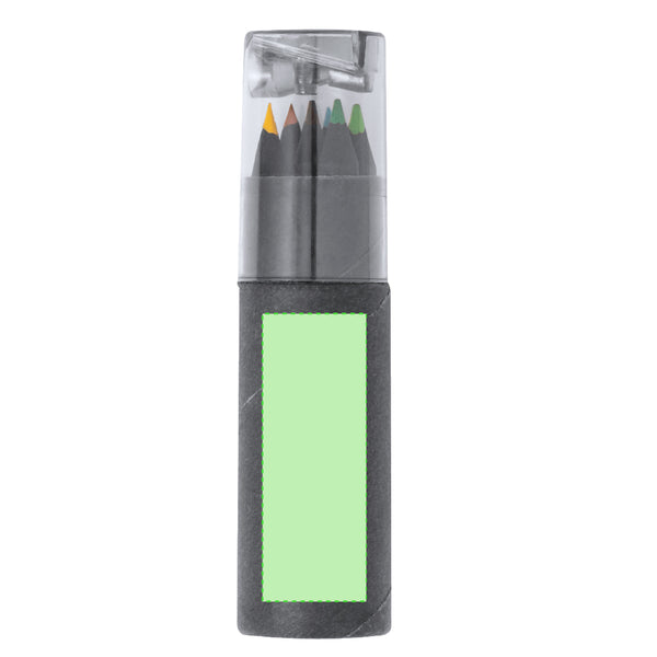 Set of 6 wooden pencils finished in black, with hexagonal body and leads in various colours. Presented in a cylindrical, black recycled cardboard box, with matching transparent hood and integrated pencil sharpener.