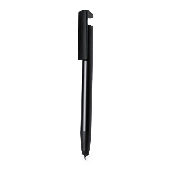 Ball pen with push-button mechanism, made of durable aluminium. With integrated mobile holder in clip and smooth barrel in a range of metallic colours. In blue ink and individually packaged in a recycled bag.