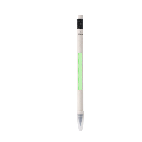 Eternal pencil made from recycled milk cartons. Reusable and with infinite writing. Including eraser at the top of the pencil. In white, with black details. With recycled milk carton logo on the barrel.Milk cartons are mostly made of cardboard and Aluminium. During the recycling process, the different packaging materials are separated for reuse and re-purposing, thus contributing to the infinite path of the circular economy. This material is well known for its high recyclability, as well as for its lightweight and resistance.