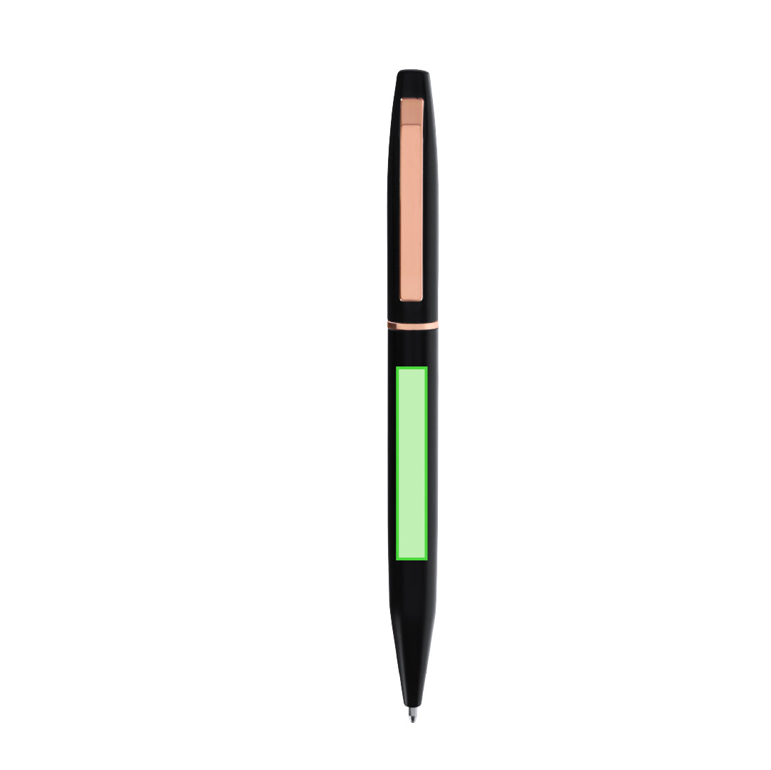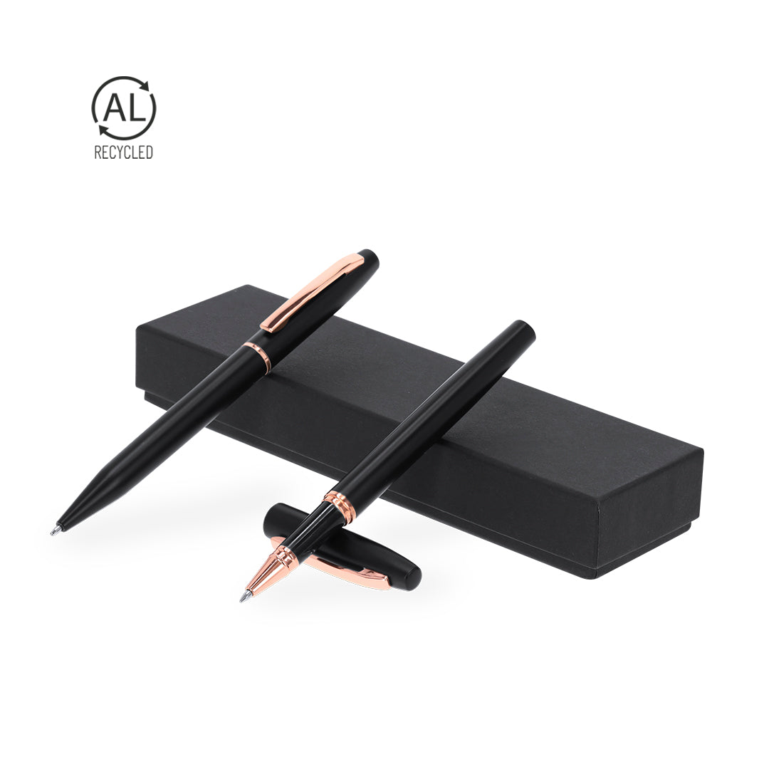 Ball pen and roller pen set made of Recycled Aluminium, in elegant matte black design with distinguished pink gold fittings. Twist mechanism ball pen and roller pen with cap, both with metal clip. In blue ink and with Recycled Aluminium logo. Presented in an elegant black case.Recycled Aluminium is a material with almost infinite recycling possibilities, without losing its original properties and consuming less energy in the process.GRS (Global Recycled Standard) certification, guaranteeing the recycled origin of the material used to manufacture the product.
