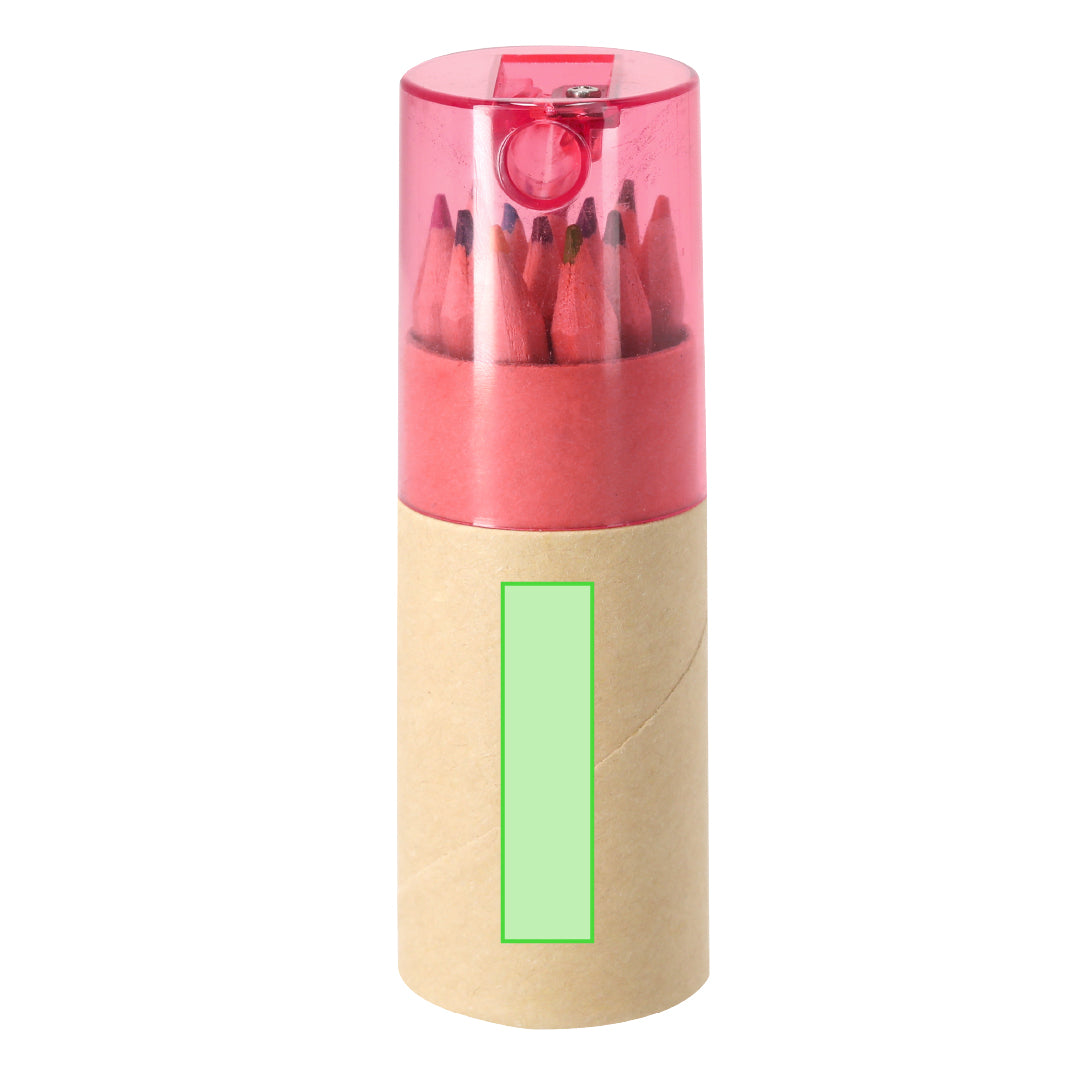 Set of 12 wooden pencils, with hexagonal body and leads in various colors. Presented in a cylindrical recycled cardboard case, with a transparent hood and integrated sharpener.