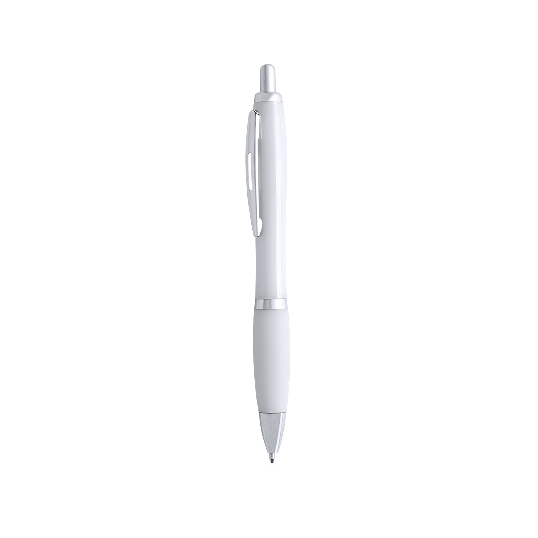 Push-button mechanism pen in resistant ABS. Clip, pusher and tip in silver. In black ink.