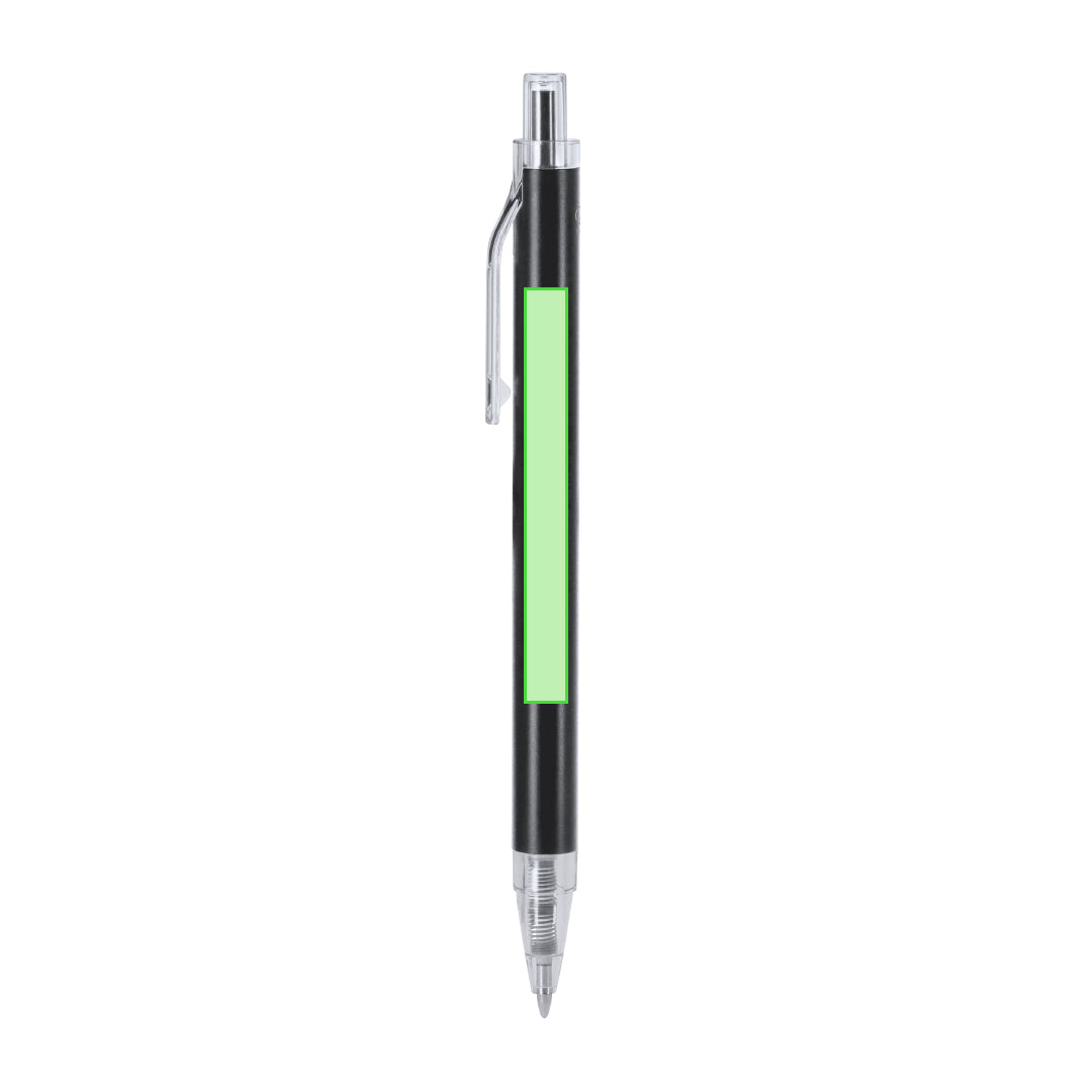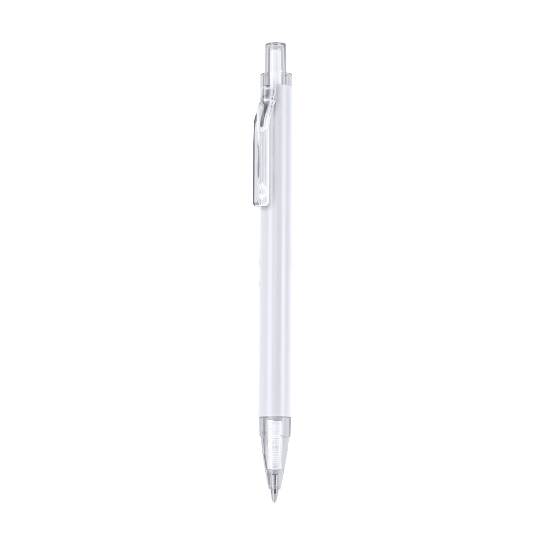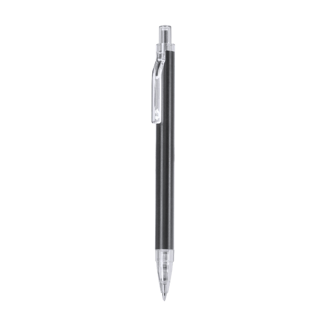 Pen with body in recycled Aluminum. Clip, push button, tip in transparent finish. Jumbo charge and in blue ink. Includes Recycled Aluminum badge.