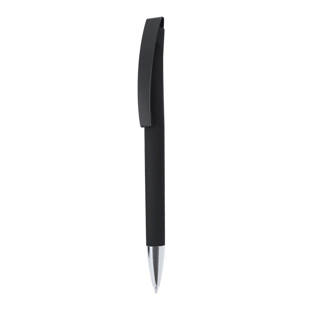 Push-button mechanism pen. Metallic finish tip. Body finished in rubber, clip specially designed for laser marking with mirror effect. In blue ink.