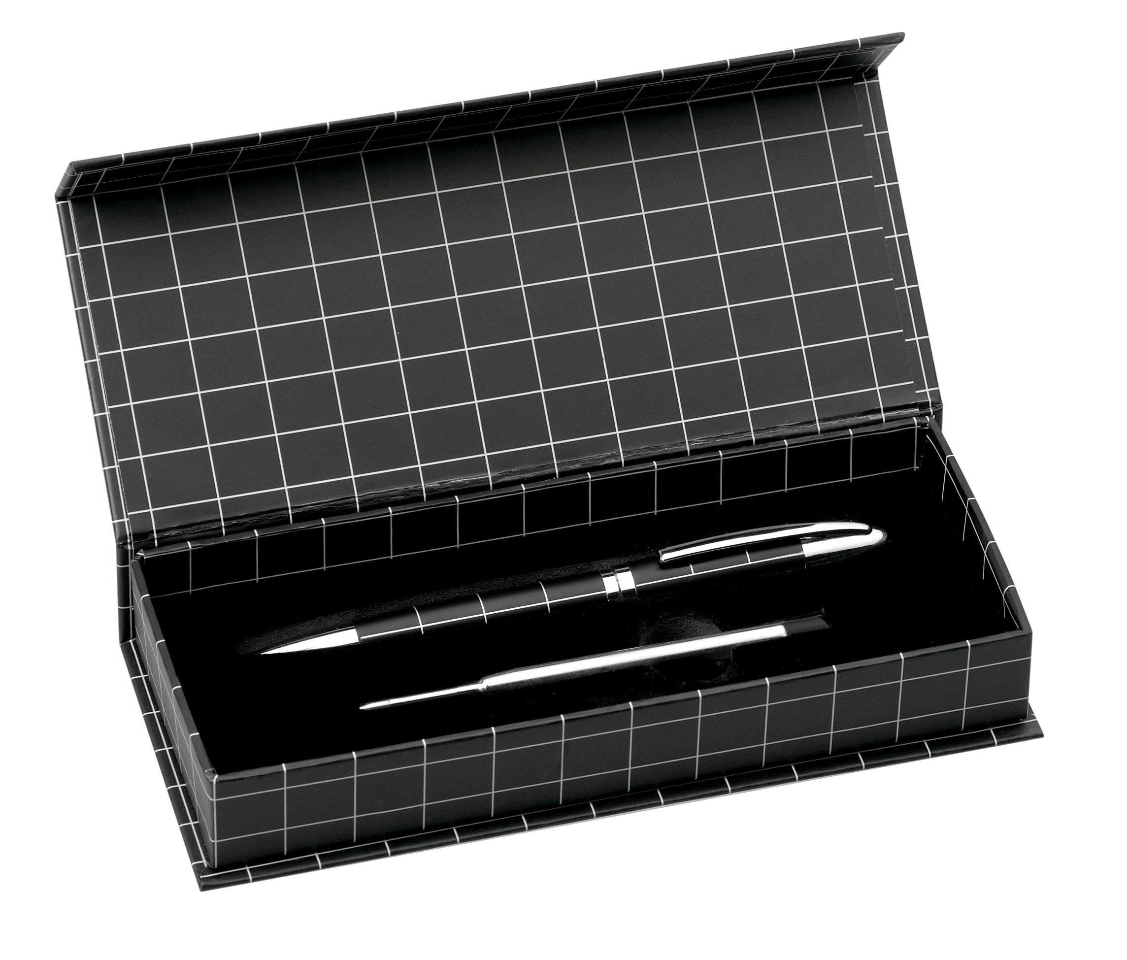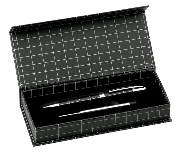Elegant ball pen with twist mechanism in sober bicolor design. Made of metal body in smooth finish with silver colored details. Presented in an elegant black individual case with magnet closure. Jumbo cartridge, with refill included and in blue ink.