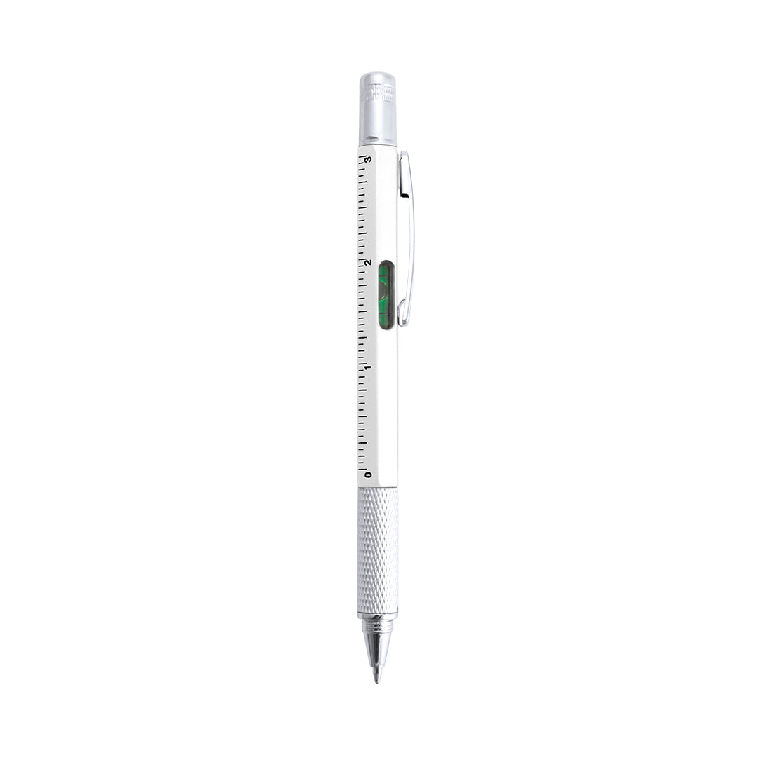 Multi-tool ball pen 4-in-1 with twist mechanism, in varied colors and with soft grip. With built-in level in body, ruler with metric system in centimeters/inches and double-head screwdriver -flat and star-shaped. With metallic clip and blue ink.