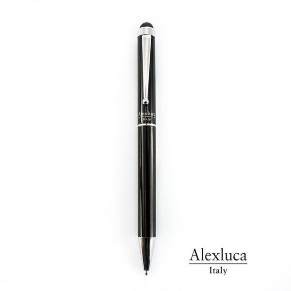 Alexluca ball pen with twist mechanism and smooth metal body in an elegant black color. Clip and design tip in matching color. Presented in an individual black box with the brand logo. Blue ink.