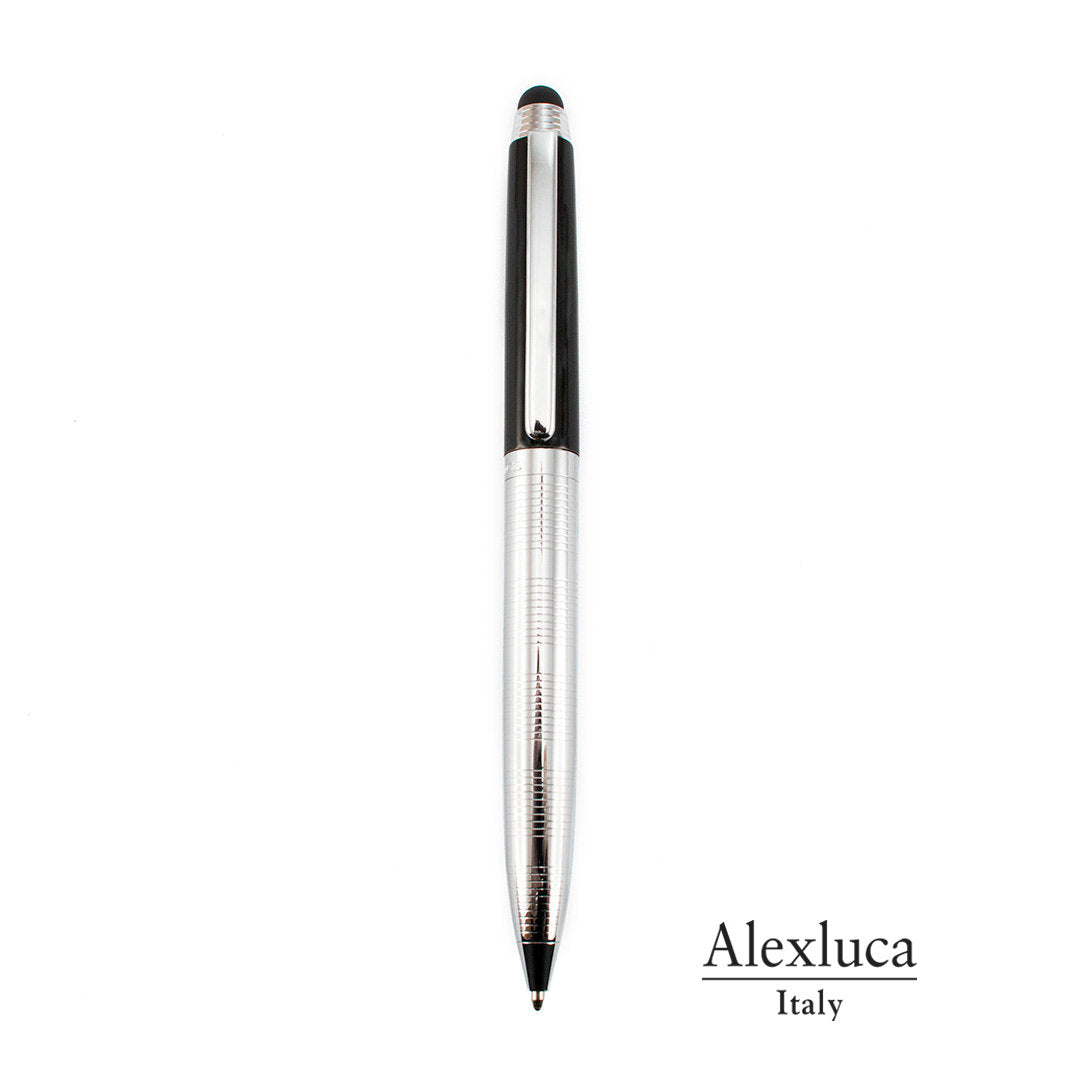 Pointer ball pen by Alexluca with twist mechanism, soft metal body and elegant combination of colors in silver and black. Clip and grip design in matching color. Presented in an individual black box with the brand logo. Blue ink.