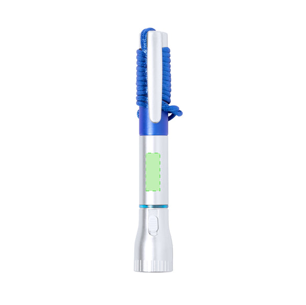 Ball pen with built-in LED flashlight. Original bicolor design and body in soft silver finish. Translucent hood in bright tones with matching color carrying strap. In blue ink with button cell batteries included.