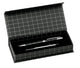 Elegant set of ball pen with twist mechanism and hooded roller hood in sober design. Non-slip metal body in shiny silver finish with matching color clip. Presented in an elegant and original individual black PU leather case with a die-cut inside in soft white velvet. Jumbo cartridge with German quality blue ink.