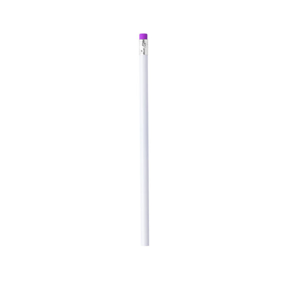 Wooden pencil in white with glossy finish. With round barrel and rubber -rubber available in a wide range of colours-. Black lead and unsharpened tip.