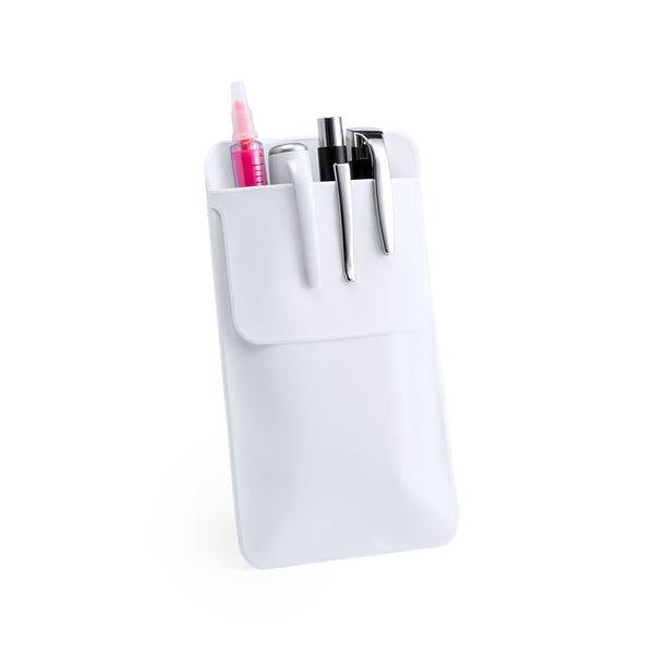 Pocket protective sleeve for ball pens and other utensils. In resistant PVC material with heat sealing finishing, including a flap for easy printing.
