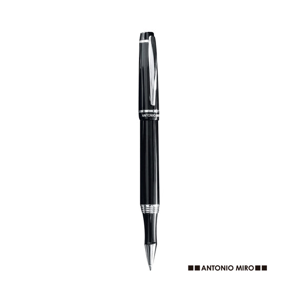 Hood roller by Antonio Miró in an elegant bicolor design, with soft metallic body in sober black color. With the brand logo under the ring and clip and tip in shiny silver finish. Presented in an individual black box with the brand logo. Blue ink.