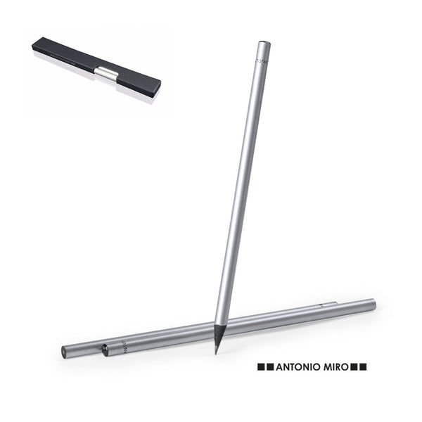 Set of 3 wooden pencils by Antonio Miró in an elegant silver finish, with the the brand logo on top. Presented in an elegant black cardboard box with window and the brand logo.