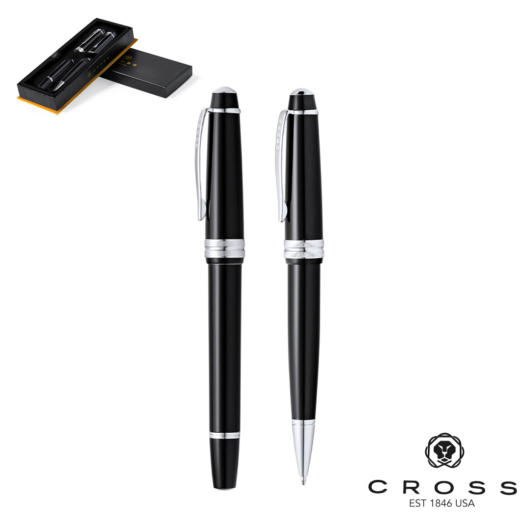 Set of ball pen and roller Cross Bailey Light, combining a high glossy resin with a polished chrome, metallic finish. Jumbo cartridge and black ink. Presented in an elegant, individual black case with brand logo and soft suede lining.