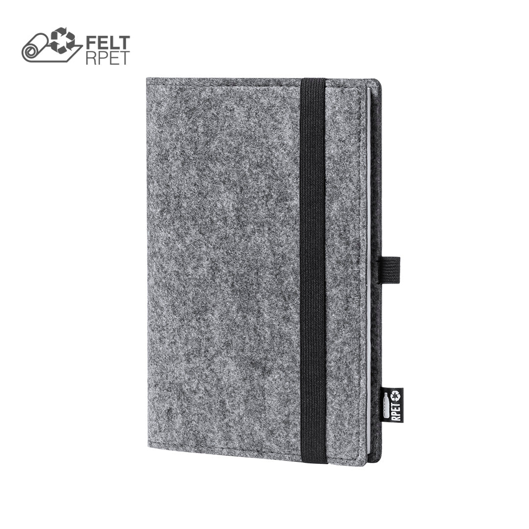 A5 nature line notepad with RPET recycled felt cover. The result of the combination of the recycling processes of plastic materials along with the millenary technique of felt manufacturing, resulting in an eco-trend material that, in addition to being of recycled origin, also becomes recyclable. Including 100 plain sheets. With elastic band, pen holder and RPET label on cover.
