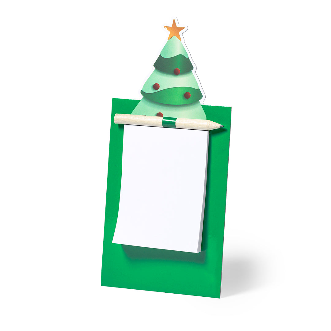 Magnet with notepad in a fun Christmas tree design. Includes 40 plain sheets and natural wood pencil.
