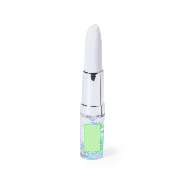 Original pen in the shape of a lipstick. With liquid inside and in a colourful design. With hood and in blue ink.