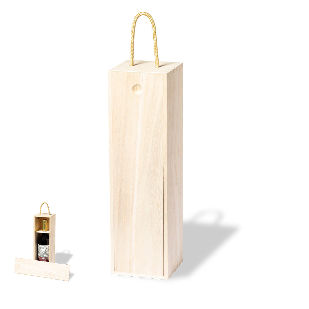 Premium presentation box for 1 bottle made of natural Paulownia wood, lightweight and resistant. Inside with safety fastening for bottle neck, with sliding lid and carrying handle-cord.