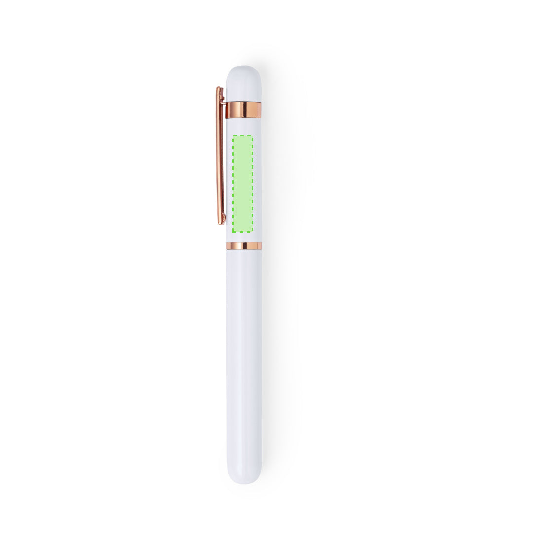 Elegant roller ball pen specially designed for laser marking with rose-coloured logo. With metal clip and plastic details in rose finish. With jumbo cartridge, blue ink and cap closure. Available in two distinctive colours.Presented in an elegant black design box.