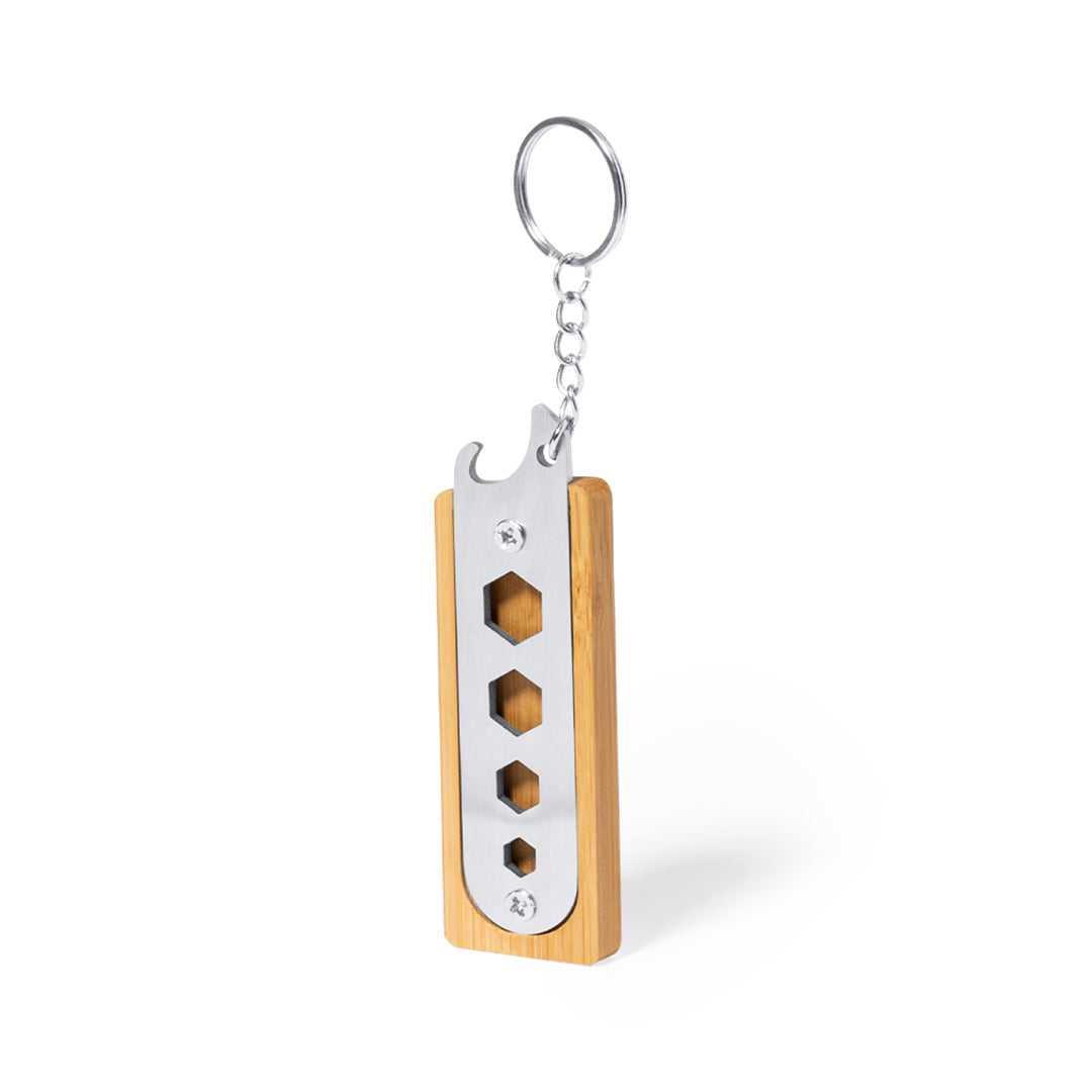 Multi-tool key ring made in durable stainless steel and bamboo. With practical set of 4 hexagon spanners and bottle opener. Presented in an individual kraft design box.