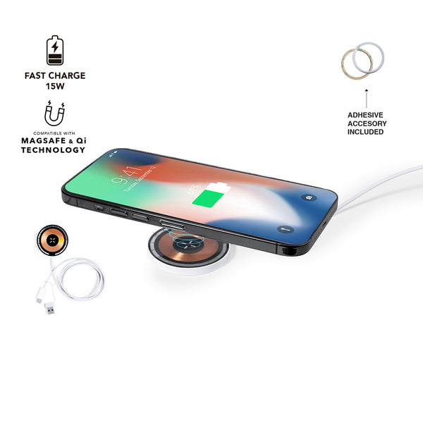 15W wireless charger in distinctive transparent design. Comfort and efficiency, with state-of-the-art charging system and compatible with Qi technology devices. Its charging surface and Magsafe technology guarantee a safe and stable connection. Type C connection, with user manual in English and Spanish. Presented in an individual kraft design box.Manufactured according to RoHS standards and in compliance with the following safety requirements:Overheating protection system.Overload protection system.Locking system to prevent short circuits.