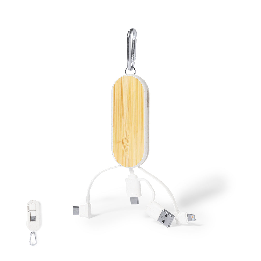 Charging cable with carabiner, made in wheat straw and bamboo. With Type-C and USB input connections and Type-C, Lightning, and Micro USB outputs. 5V DC 2A.Presented in an individual kraft design bag.Made with vegetal elements to promote the use of natural raw materials and reduce pollutant emissions.