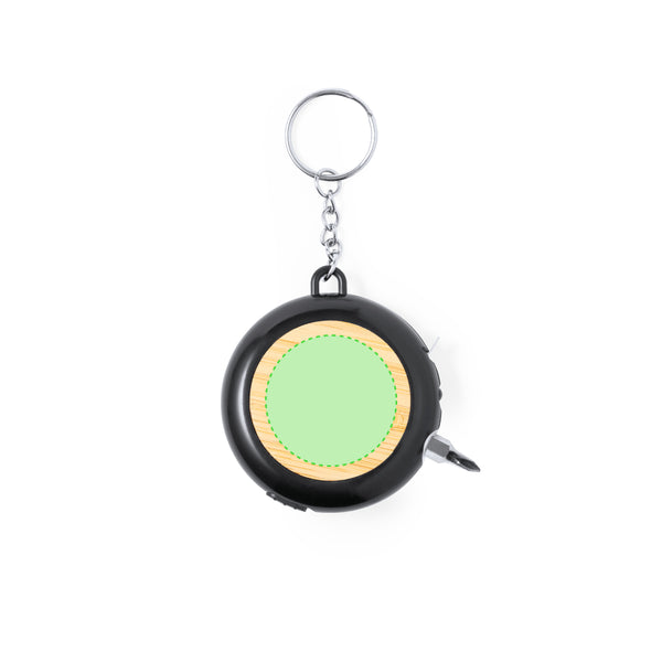 Handy flexometer made of resistant combination of bamboo and ABS, with integrated multi-tool in body and lid closure. 4 functions: LED torch (button batteries included), 1-metre tape measure -in centimetres and inches-, and a magnetic screwdriver head with flat and phillips bits. Also comes with a key ring and is presented individually in a kraft box.Materials such as bamboo promote the use of natural raw materials, thus reducing pollutant emissions. It comes from a highly resistant and versatile plant, with rapid growth and regeneration, making it an excellent alternative to the use of traditional wood.