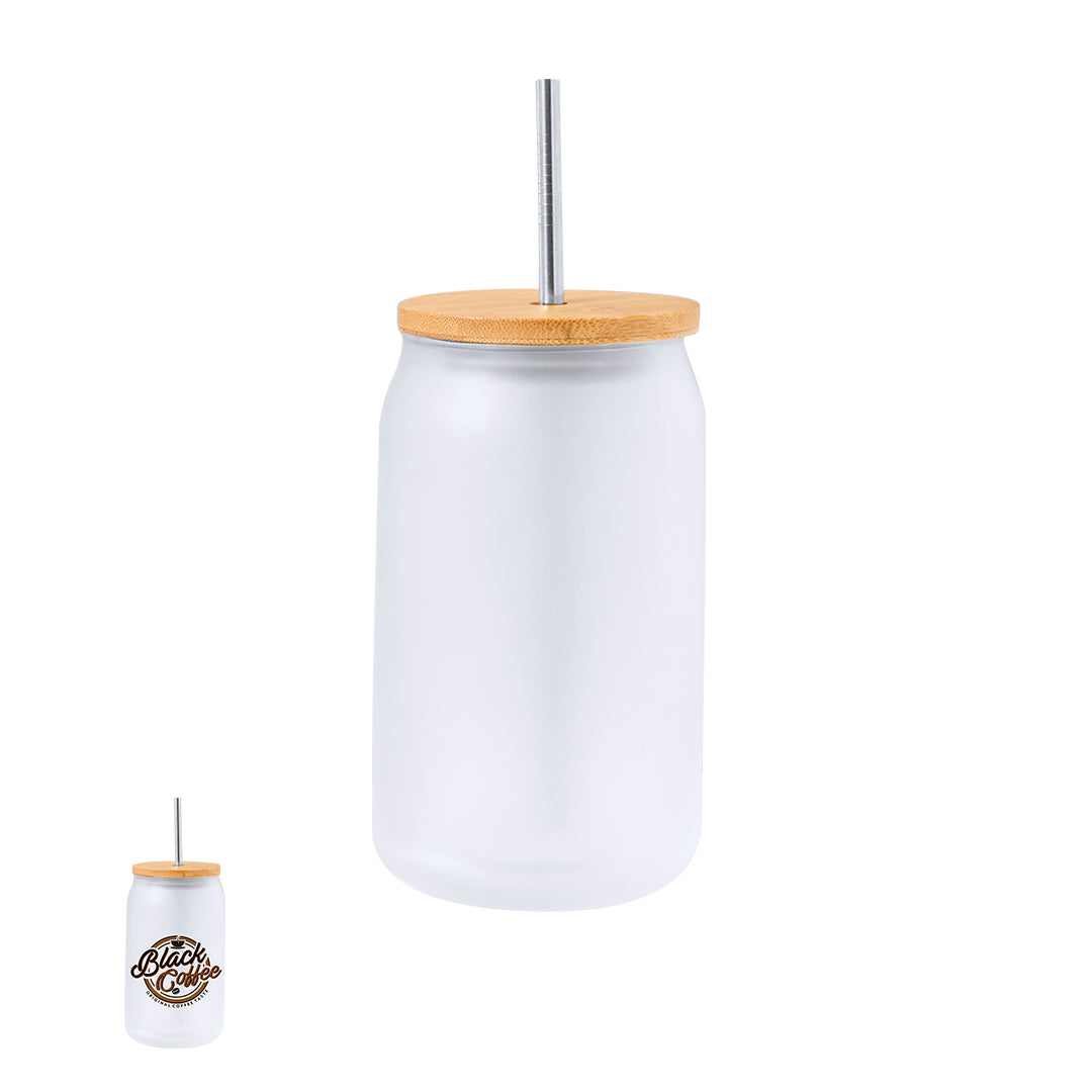 Sublimation jar with body made in resistant frosted glass, with 400 ml capacity. Bamboo push-on lid with straw slot (straw included, made in stainless steel). Specially designed for sublimation printing. Presented in an individual kraft box.